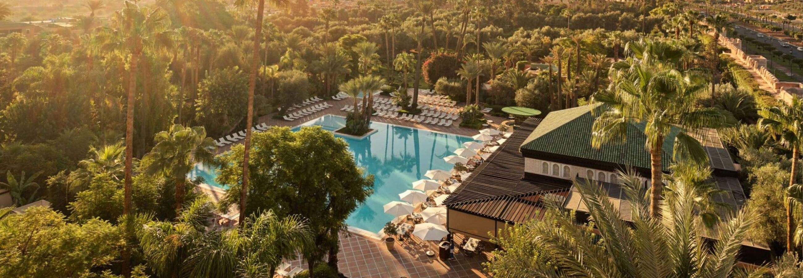 Sus interiores ricamente decorados, inspirados en la arquitectura morisca, están llenos de detalles artesanales, desde los zellige coloridos hasta las intrincadas tallas de madera, creando un ambiente que transporta a los huéspedes a otra época. Los exuberantes jardines del hotel, que se extienden por ocho hectáreas de palmeras, rosales y naranjos, proporcionan un refugio tranquilo en el corazón de la vibrante ciudad.